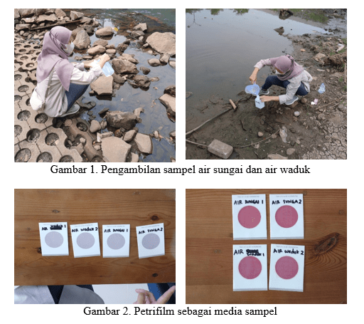 Pegambilan sampel dilakukan di Sungai Krengseng dan Waduk Pendidikan Undip, kemudian sampel dibawa ke laboratorium untuk diuji. Pengujian E.coli dan Total Coliform membutuhkan waktu selama 48 jam. Metode yang digunakan pada penelitian ini yaitu 3M Petrifilm (modified violet-red bile media) mengandung 2,3,5-trifeniltetrazolium klorida dan indikator glukuronidase yang membentuk endapan biru di sekitar koloni E.coli yang mungkin ada. Dalam proses ini terdapat 3 tahapan yang dilalui yaitu, inokulasi, inkubasi, dan pengamatan.