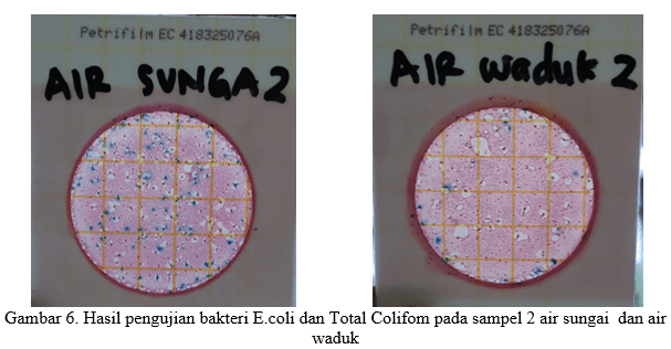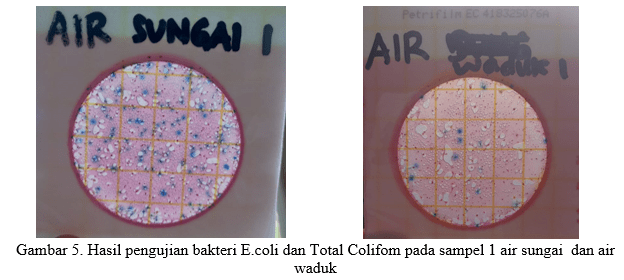 Dari 2 sampel yang diuji duplo, hasil pengujian menunjukan bahwa sampel air sungai dan waduk mengandung banyak bakteri E.coli dan Total coliform seperti yang tertera pada gambar.